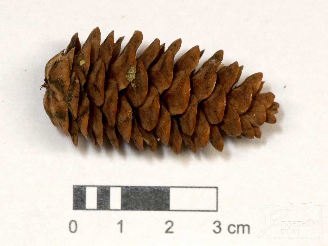 Šišky: vejčitě válcovité, štíhlé, světle hnědé, oranžově hnědé, až červenohnědé, tuhé, 3–7 cm dlouhé, zavřené 1,5 cm a otevřené až 2,5 cm široké. Šupiny šišek jsou vějířovité, měkké, nejširší blízko zaobleného vrcholu, na konci zaokrouhlené.